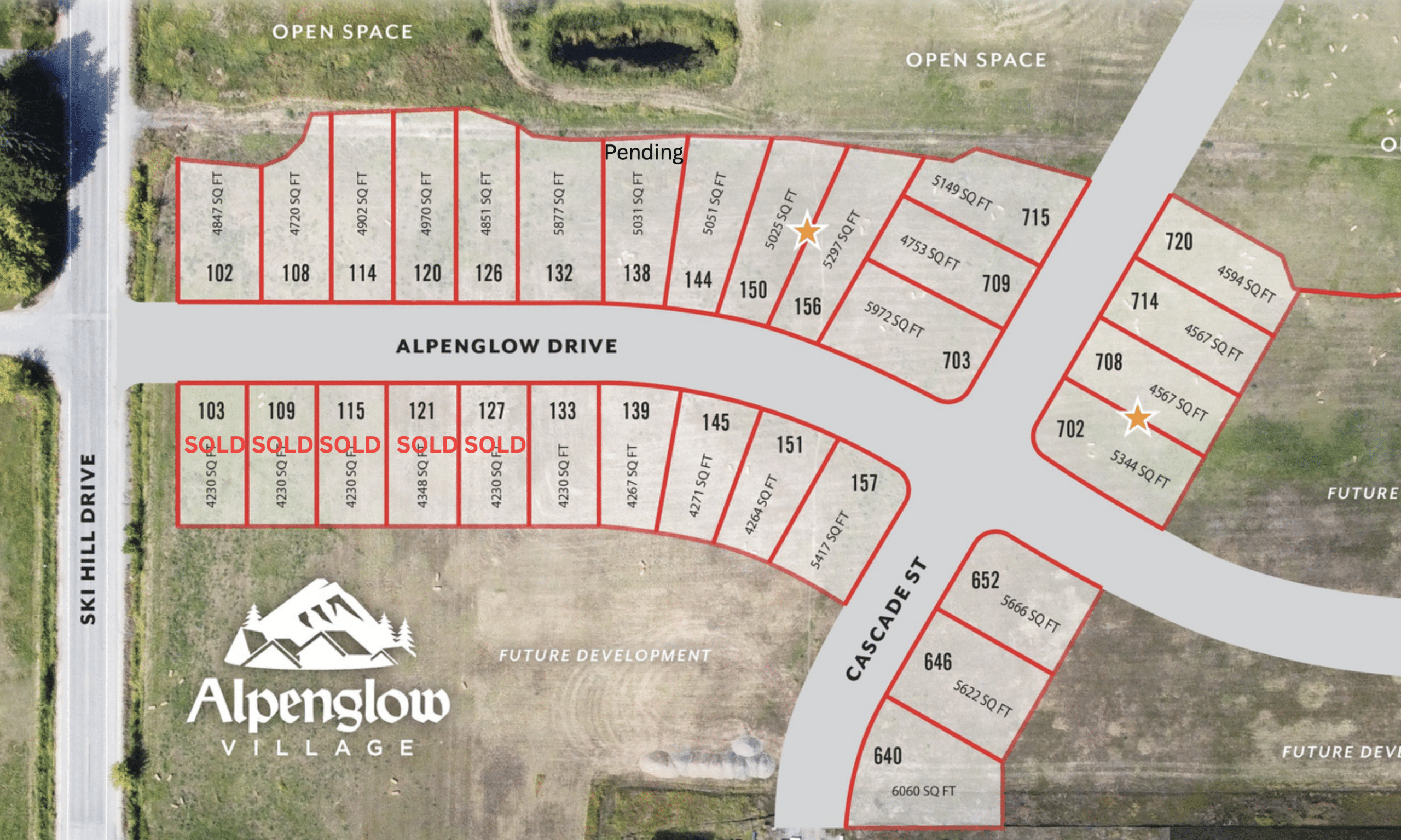 Here is the availability map as of April 2026 for the building lots in Alpenglow Village.